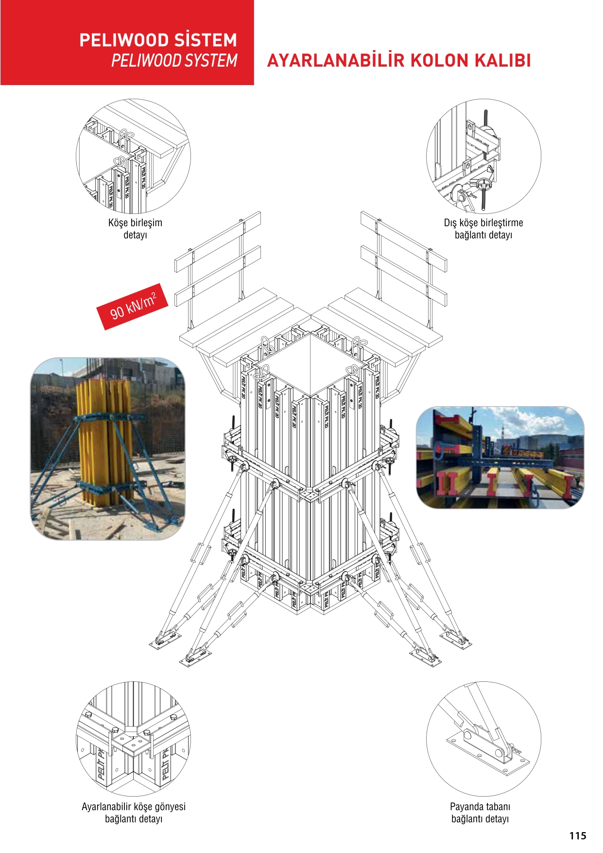 PELIWOOD Kolon Kalıp Sistemi 4 ana bileşenden oluşur; plywood, ahşap kirişler, kolon kuşakları ve köşe bileşenleri. Bu sistem, farklı yüklerle farklı projelere uyarlanabilen esnek bir sistemdir.