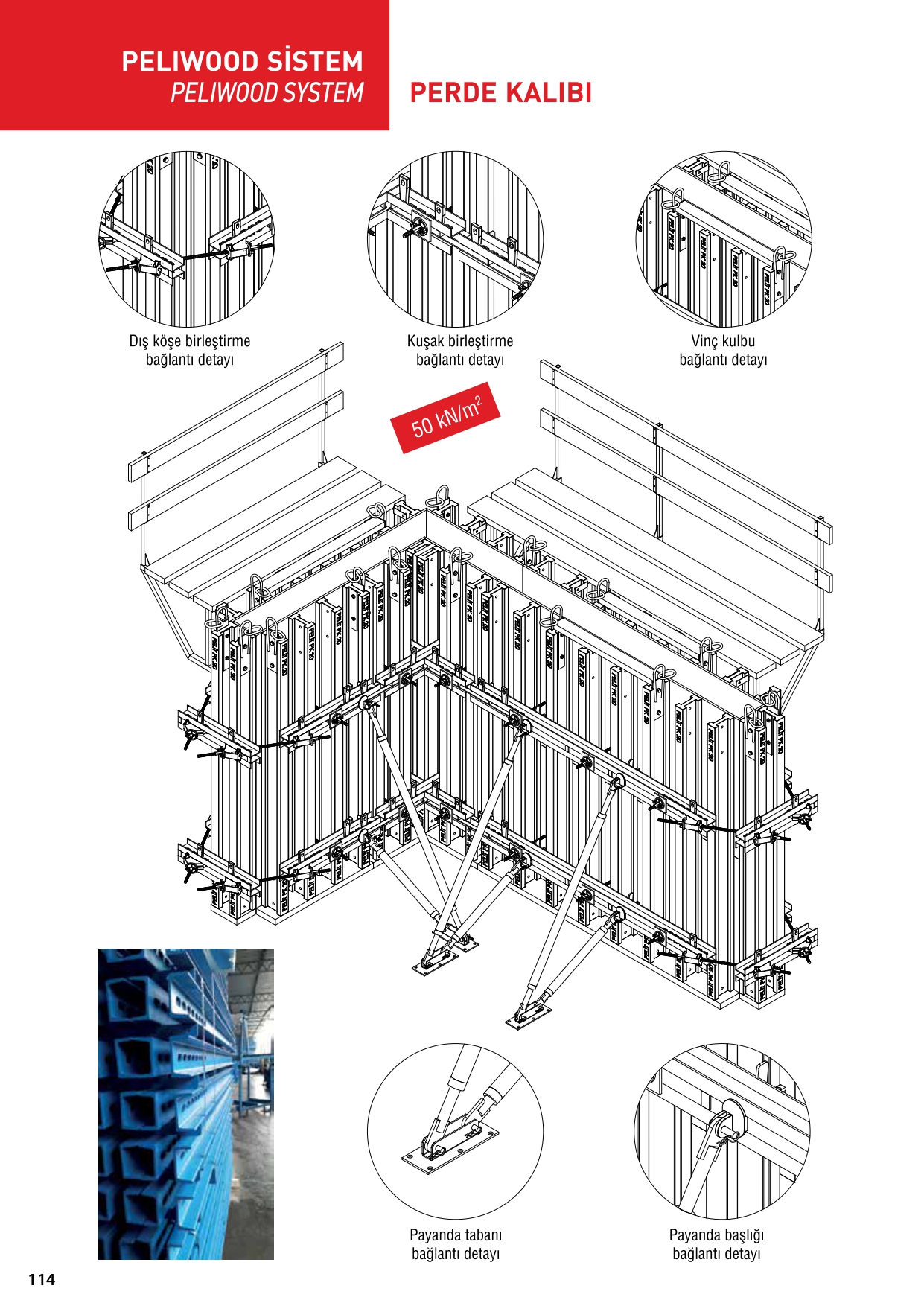 PELIWOOD Perde Kalıp Sistemi 3 ana bileşenden oluşur; plywood, ahşap kirişler ve çelik kuşaklar. Bu Sistem, farklı yüklerle farklı projelere uyarlanabilen esnek bir sistemdir.